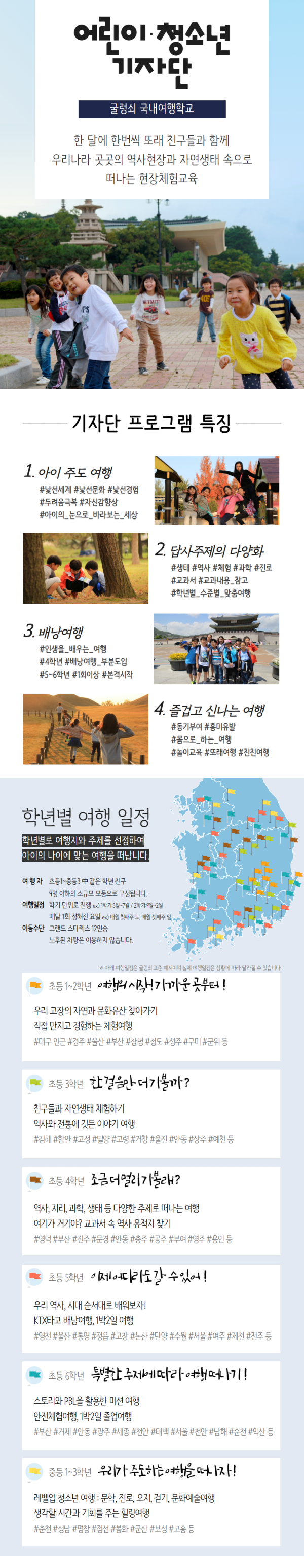 어린이·청소년 기자단, 우리끼리 떠나자 맞춤여행, 찾아가는 여행인문학, 어린이 역사교실2. 홈페이지 신청(로그인 필수) 해외배낭여행, 기차타고 배낭여행, 방학캠프, 정기설명회